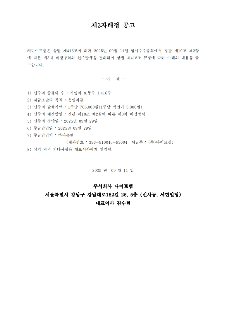 ㈜다이트랩은 상법 제416조에 의거 2025년 09월 11일 임시주주총회에서 정관 제10조 제2항에